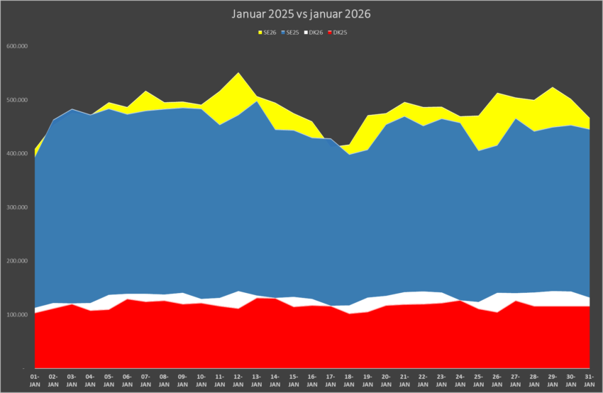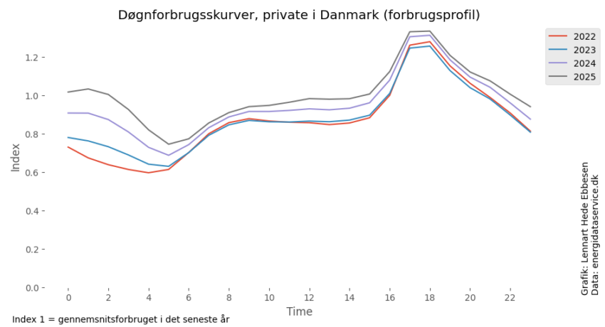 Nætterne er stadig bedst, men kulden varer ved, hvilket giver høje priser generelt. De laveste priser i prognosen er natten til lørdag og natten til søndag, hvorefter priserne løfter sig igen. Næste uge kan få nogle gedigne høje priser Dagens graf viser hvordan dagsforbruget for private forbrugere i Danmark har været hen over døgnet de…