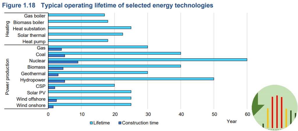 Vi skal have elektrificeret samfundet, der skal investeres, og der skal bygges. IEA har nogle ret fine illustrationer af hvor lang tid det tager at bygge energiteknologi fra der er taget investeringsbeslutning, til anlægget står færdigt og hvor lang tid anlægget forventes at køre.
