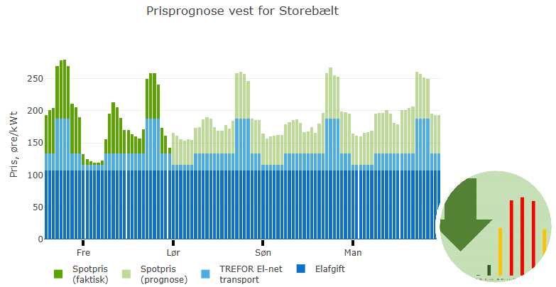 — Gem elforbruget til lørdag og/eller søndag! Fredagens spotpriser ligger en smule højere end torsdagens spotpriser, men lavere end mandagen og tirsdagens høje spotpriser. — Weekenden byder, iflg. prognoserne, op til en god gang vedvarende energiproduktion med dertilhørende lavere priser omkring frokost – dog vil vi kun i enkelte timer formentlig nå nogle lave niveauer….