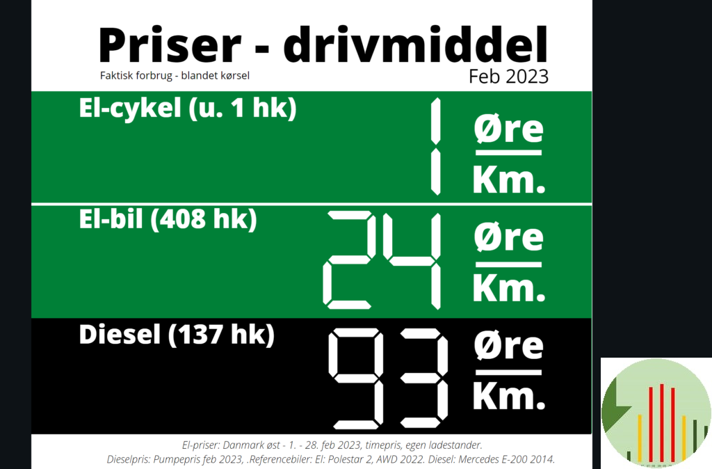 Rasmus Krochin Sørensen har begået dagens illustration, der viser hvad det har kostet ham i brændsel at køre en kilometer i februar, afhængigt af køretøj.