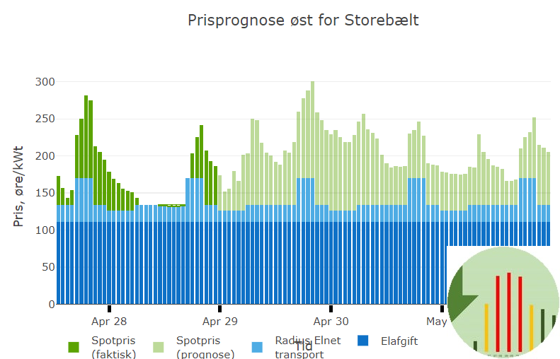 Jeg glæder mig i øvrigt til weekenden, for Jesper har løst opgaven med negative priser forbilledligt: Øjet aflæser højden på søjlerne er som den samlede pris, selv om prisen er negativ. Det kan lige anes søndag eftermiddag, hvor søjlehøjden lige netop falder en smule. Øjet læser areal, så når der kommer store negative priser, vil det være nemt at se de gode priser skille sig ud. Den valgte løsning har jeg ikke set andre steder, og det virker ret godt.