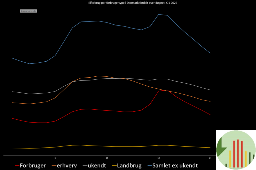 Jeg kiggede lidt på morgenspidsen. Den største bidragsyder efter forbrugere på i det tidsrum er “El-, gas-, varme- og vandforsyning”. Igen er det et forbrug der kan påvirkes direkte af os forbrugere.