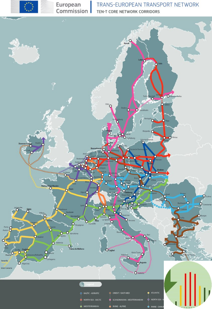Fra 2025 skal der være en hurtiglader på mindst 150 kilowatt for hver 60 km langs de vigtigste transportkorridorer, TENTec (dagens kort).