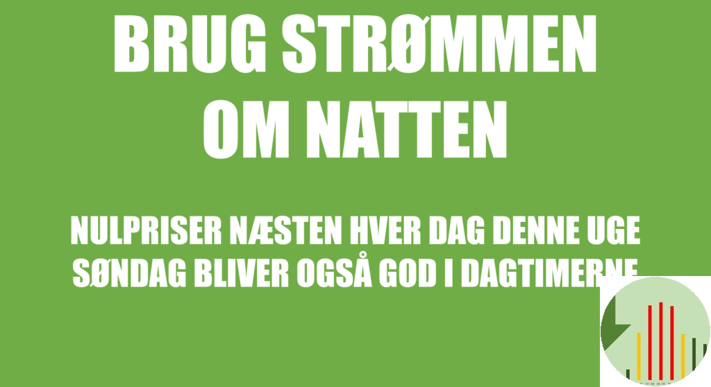 Elpriserne rammer nul næsten hver nat resten af ugen. Søndag bliver også en rigtig god dag med meget lave priser og lav CO2 udledning. DEL GERNE, så flest muligt kan få glæde af de lave strømpriser, der indtil videre ser ud til at holde frem til og med tirsdag den 17.