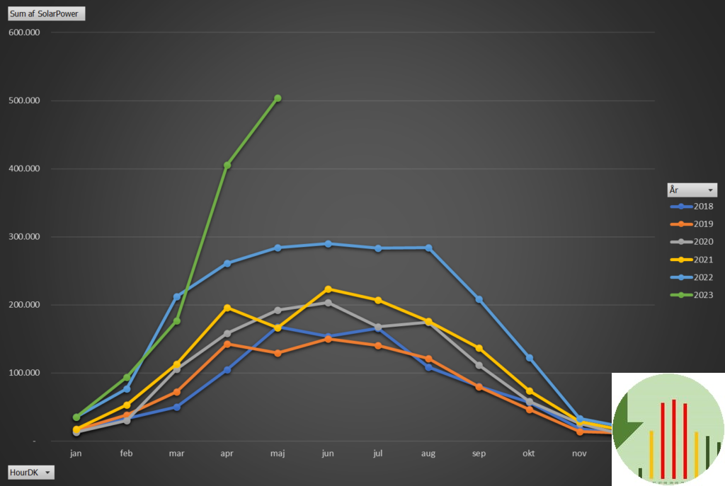 Dagens illustration er solcelleproduktion i Danmark måned for måned fra 2018 til nu. Den lyseblå kurve er sidste år, den grønne er år til dato.