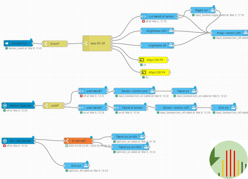 Dagens eksempel er fra Rasmus L. Bidstrup, der har lavet dagens automation i illustrationen. Tænder man på kontakten kommer der lys i badeværelset – og radio! Dertil tjekker automationen om det er nat, for så dæmpes lyset til halv styrke. Dertil kan lyset også styres af en sensor, som tænder hhv slukker lyset når der er nogen i badeværelset. Her er vi lige et enkelt skridt over hvad man kan med gammeldags teknologi. Det hele er nemlig koblet sammen, så man godt kan tænde på kontakten, men få slukket lyset automatisk, når man forlader badeværelset.