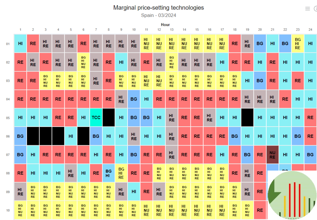 Kilde: https://www.omie.es/en/market-results/monthly/daily-market/marginal-price-technologies?scope=monthly&year=2024&month=3&country=1 med tak til Julien Jomaux.