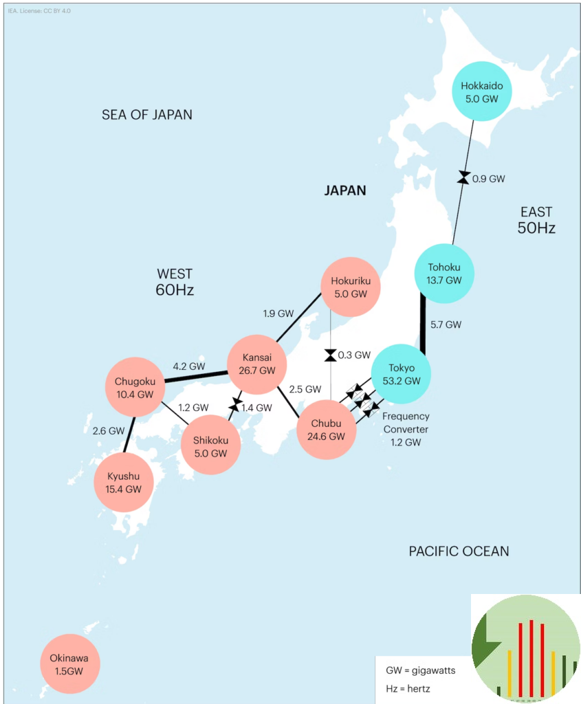 Japans eltransmissionssystem ⚡ er opdelt i to teknologisk forskellige regioner, der kører på 50 Hz for det østlige Japan og 60 Hz for det vestlige Japan.