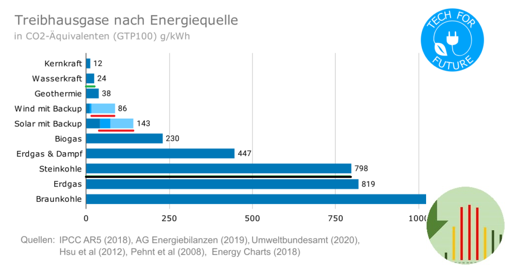 Dagens graf er nogenlunde retvisende, men så alligevel ikke: Vind og sol opgives ‘mit Backup’, der oversættes til dansk som : ‘Med omkostningerne der skal dække elforbruget, når anlægget ikke kører’. Det er helt korrekt at tænke på de her omkostninger, men samtidig meget kompliceret: Som jeg læser grafen er ‘backup’ de med rødt understregede dele af bjælkerne.