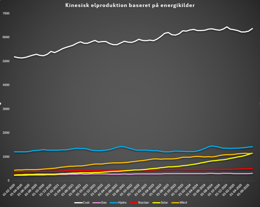 Dagens graf (elproduktion fra forskellige kilder, TWh/år udglattet) viser hvor stor en opgave Kina har foran sig: Kulforbruget synes at have nået et plateau.