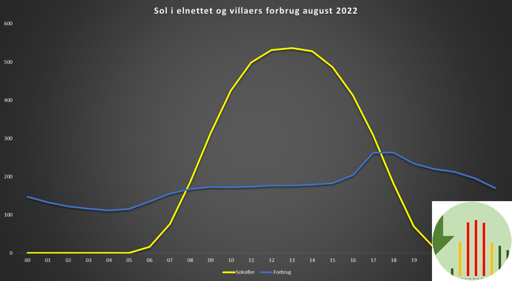 De to mål er desværre indbyrdes i modstrid: Om sommeren er strømmen grønnest midt på dagen, hvor elnettet er mere belastet end om natten. Dagens illustration viser problemet: Den gule kurve er gennemsnitlig solproduktion i august 2022, den blå er gennemsnitligt forbrug i villaer uden elvarme i samme periode.