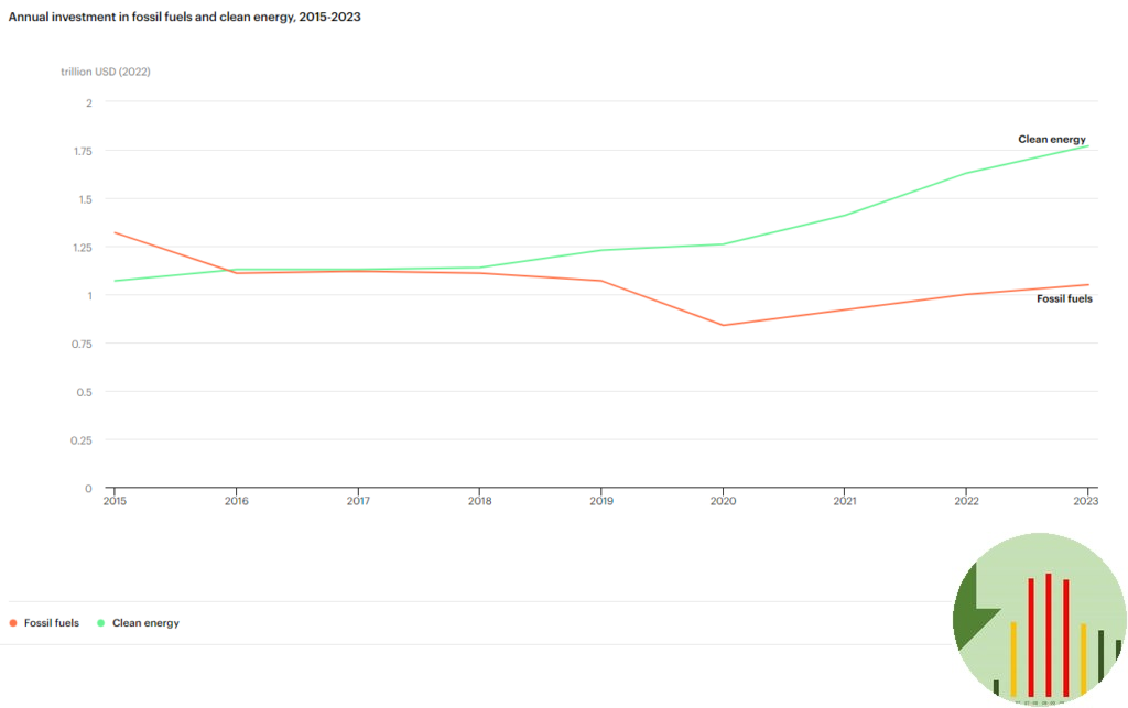 Dagens graf er en positiv overraskelse: Siden 2017 har vi investeret større summer i vedvarende energi, end vi har i fossile brændsler.