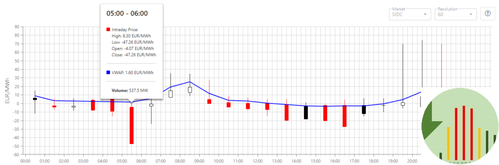 Den blå kurve viser den gennemsnitlige pris i intraday i området, det er ikke ret langt fra spotpriserne.