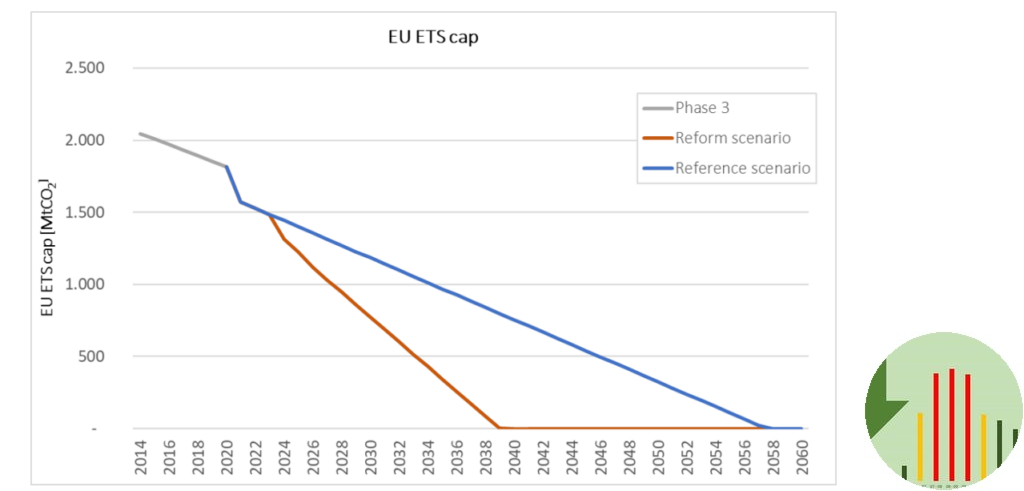 Dagens illustration viser hvad der oprindeligt var planlagt, og den nye reformerede kurs, der bringer os til en verden uden CO2-kvoter i 2040.