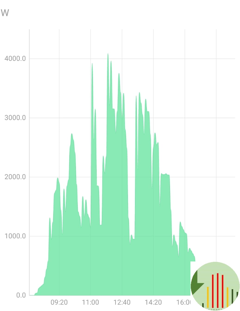 Billedet viser hvor mange Watt husets solpaneler giver i løbet af en dag. Udsvingene er ret skarpe når skyerne leger Titte-bøh (også kaldet Borte-tit https://www.alt.dk/boern/nar-baby-bliver-vaek ) – det ene øjeblik dækker en sky for solen, det næste øjeblik er skyen væk, og solen stråler igen. Når skyen dækker for det ene hus, skinner solen på et andet hus, og sådan udjævner de to huses solpaneler hinanden. Det ser vi på i morgen!