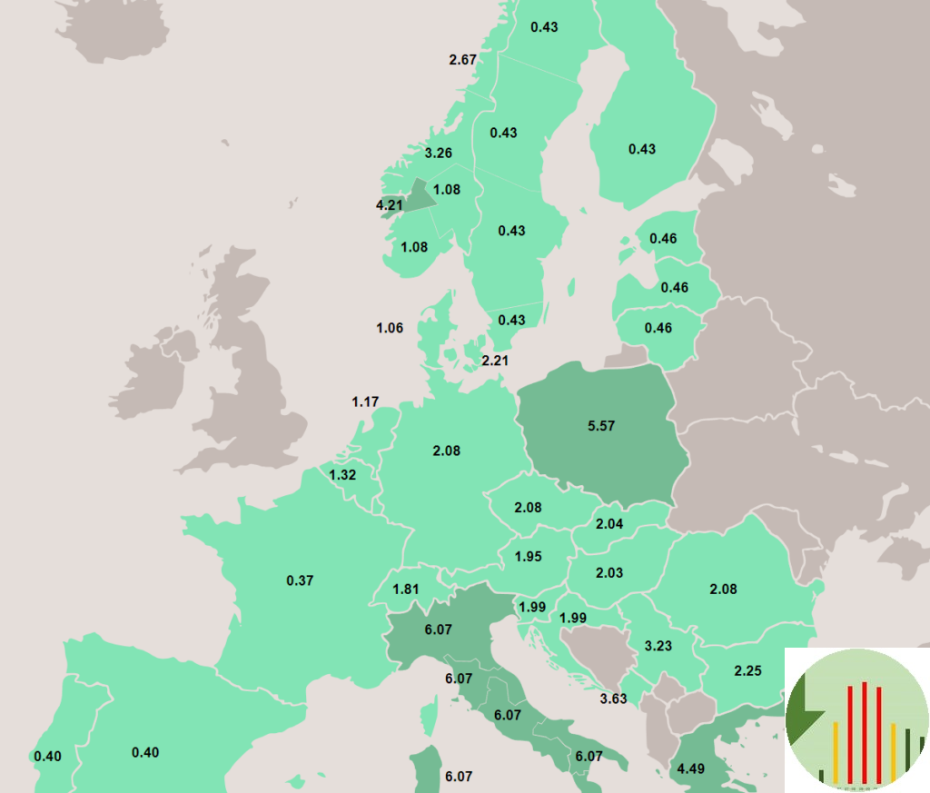 Elpriserne rammer bunden i Europa i dag: Mildt vejr, sol og vind giver et europakort med vildt lave gennemsnitspriser for søndagen. Dyrest er Italien og Polen, men 6€/MWh eller 5 øre/kWh er et eksempel på, at omstillingen til vedvarende energi har sine fordele.