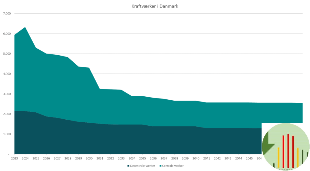 Ligeledes ser det ud med kraftværker generelt i fremtidens Danmark. Grafens lyse farver er det store centrale kraftværker, der er tilsluttet transmissionsnettet. Dem mener Energistyrelsens analyseforudsætninger vi afmonterer halvdelen af frem mod 2030.