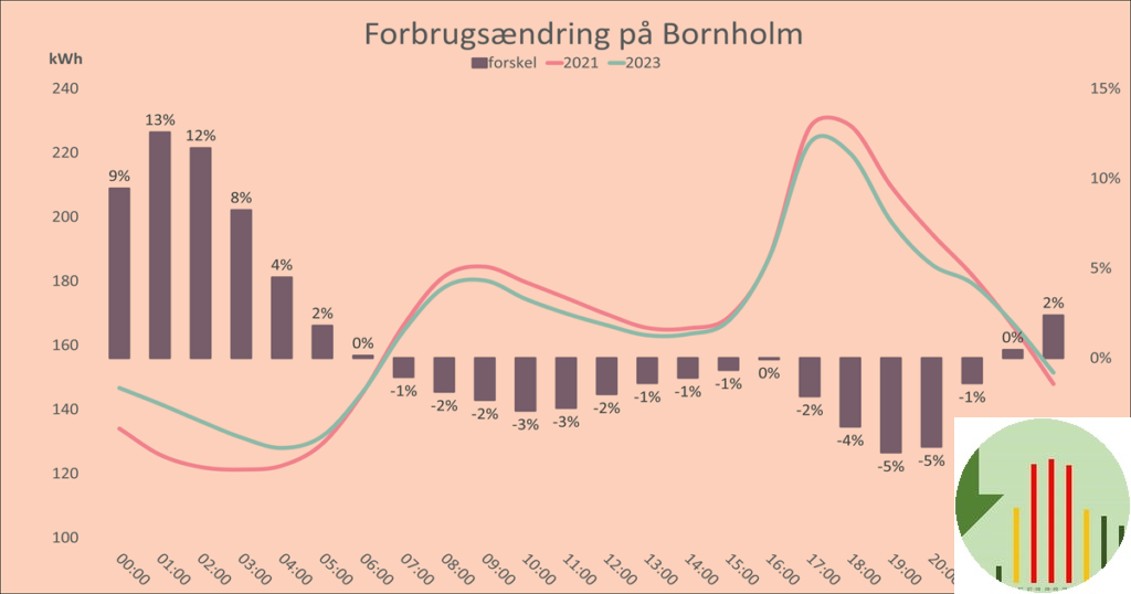 Dagens grafer viser med rødt hvordan bornholmernes forbrug fordelte sig over døgnet i 2021, og med grønt hvordan det er fordelt i 2023, efter den nye tarifmodel kom.