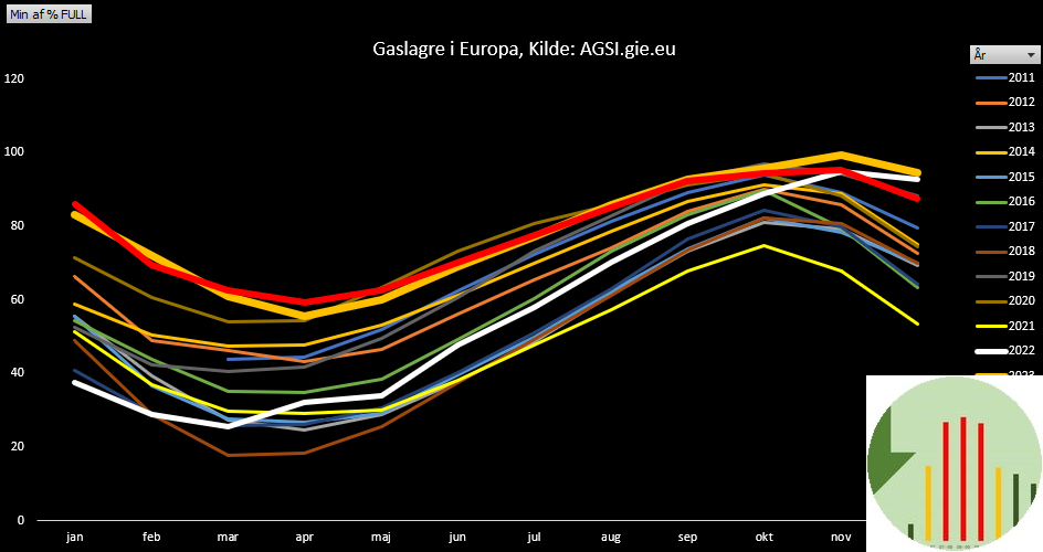 Gaslagrene er den røde kurve i dagens graf, og gaslagrene har taget et godt dyk ned i forhold til andre år. Det er perioden med 40-års-minimum af vind, der trak om ikke tænder ud, så gas. Dertil kommer kolde vejrudsigter over resten af Europa (modsat lunkne Danmark), hvilket betyder endnu mere gasforbrug, især til bygningsvarme, men også til el.